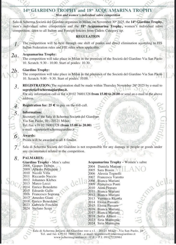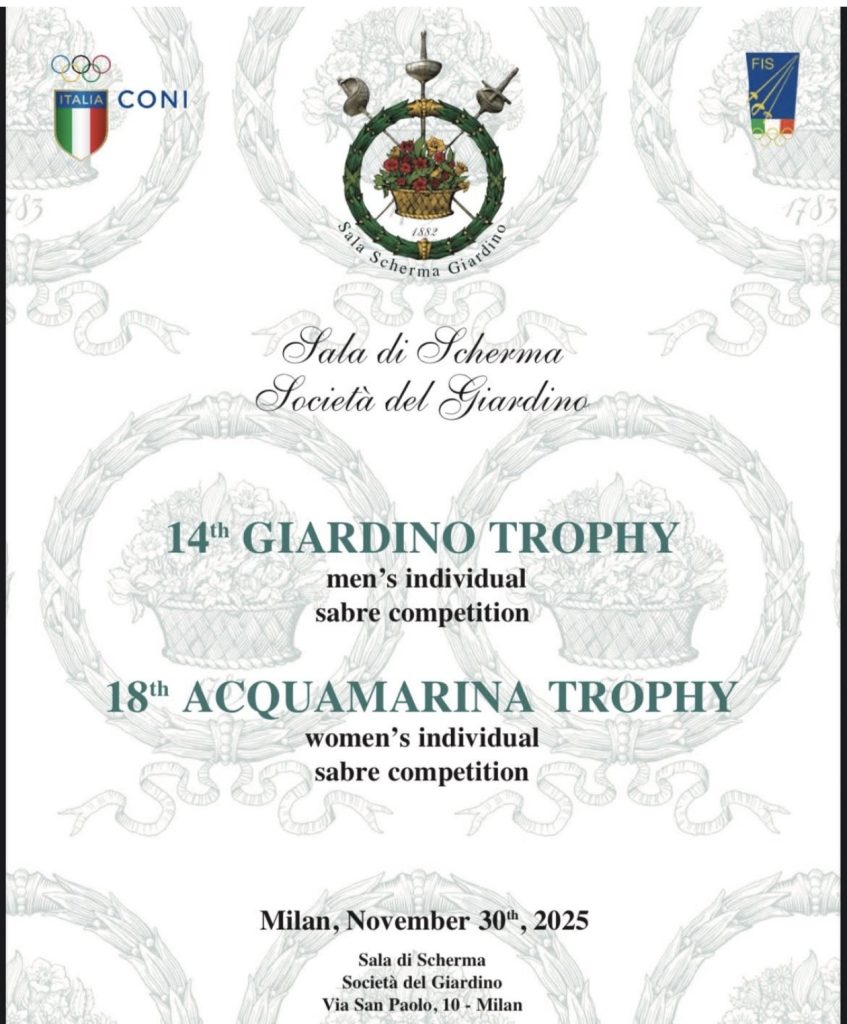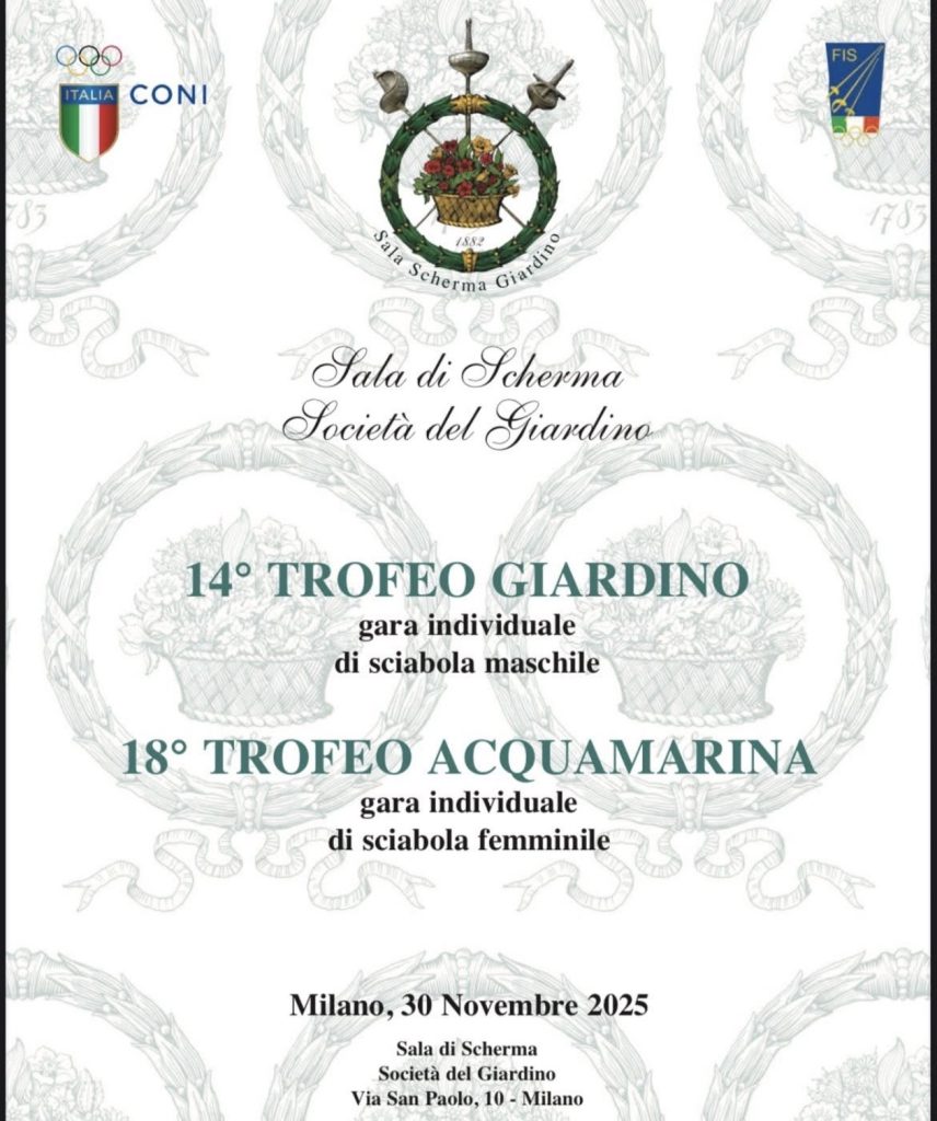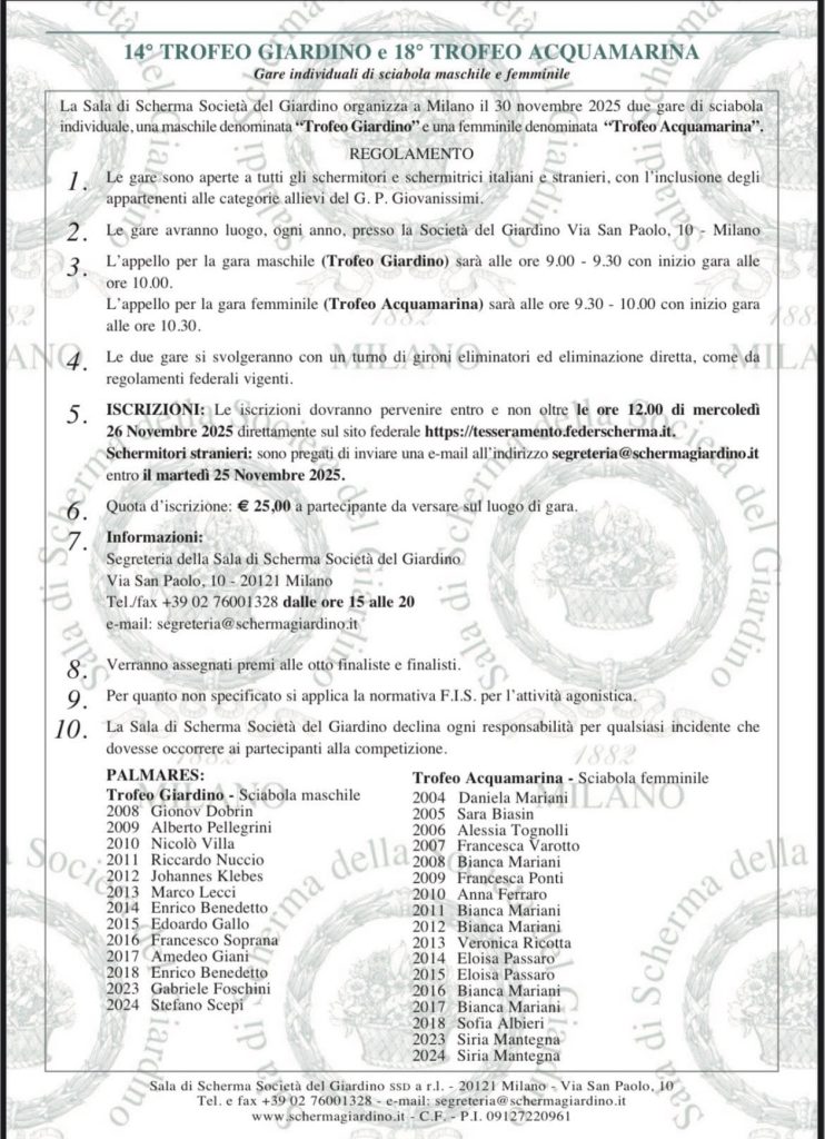 Domenica 30 Novembre presso la nostra Sala di Scherma Società del Giardino si svolgerà la 14ma edizione del Trofeo Giardino di Sciabola Maschile e la 18ma edizione del Trofeo Acquamarina di Sciabola femminile dalla categoria cadetti/cadette in su