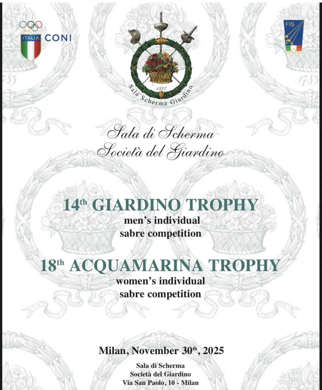 On Sunday the 30th of November our Salle organizes the 14th edition of the Male Sabre Giardino Trophy and 18th edition of the female Sabre Acquamarina Trophy open form Cadet category on